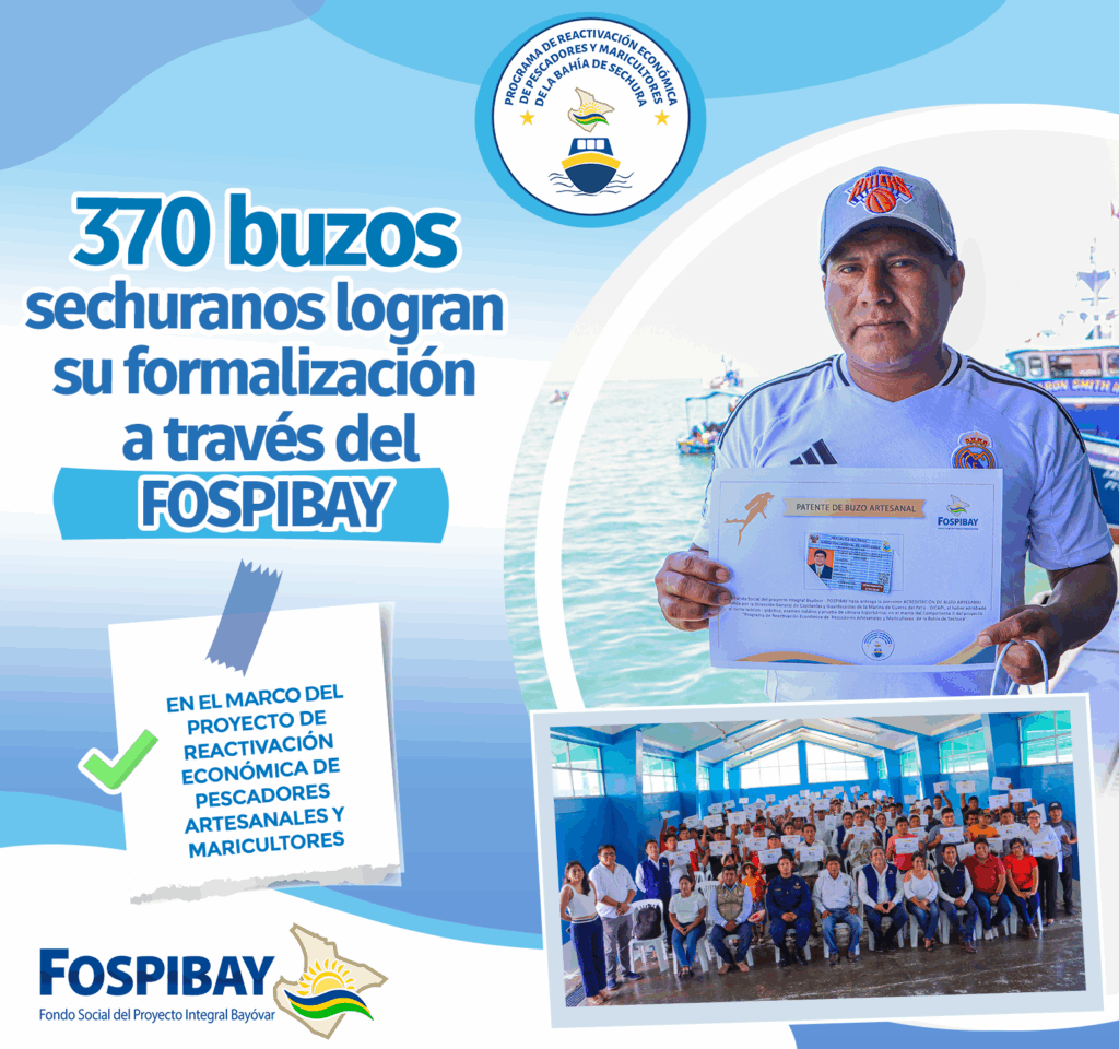 Buscando mejorar las actividades de la maricultura en la bahía de Sechura, el Fondo Social del Proyecto Integral Bayóvar (Fospibay) en convenio con DICAPI, ha logrado entregar a la fecha 370 patentes de buceo, los cuales benefician directamente a buzos artesanales de Puerto Rico Bayóvar, Parachique, Matacaballo, Constante y Sechura.