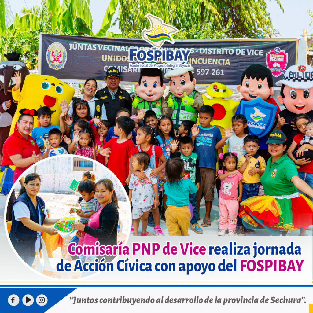 Como parte del trabajo comunitario en el fortalecimiento de la prevención de riesgos que realizan las dependencias policiales de la provincia de Sechura, la Comisaria Sectorial Rural del distrito de Vice llevó a cabo la II Acción Cívica de Proyección Social dirigido a niños, jóvenes y adultos del A.H. Las Mercedes del distrito de Vice.