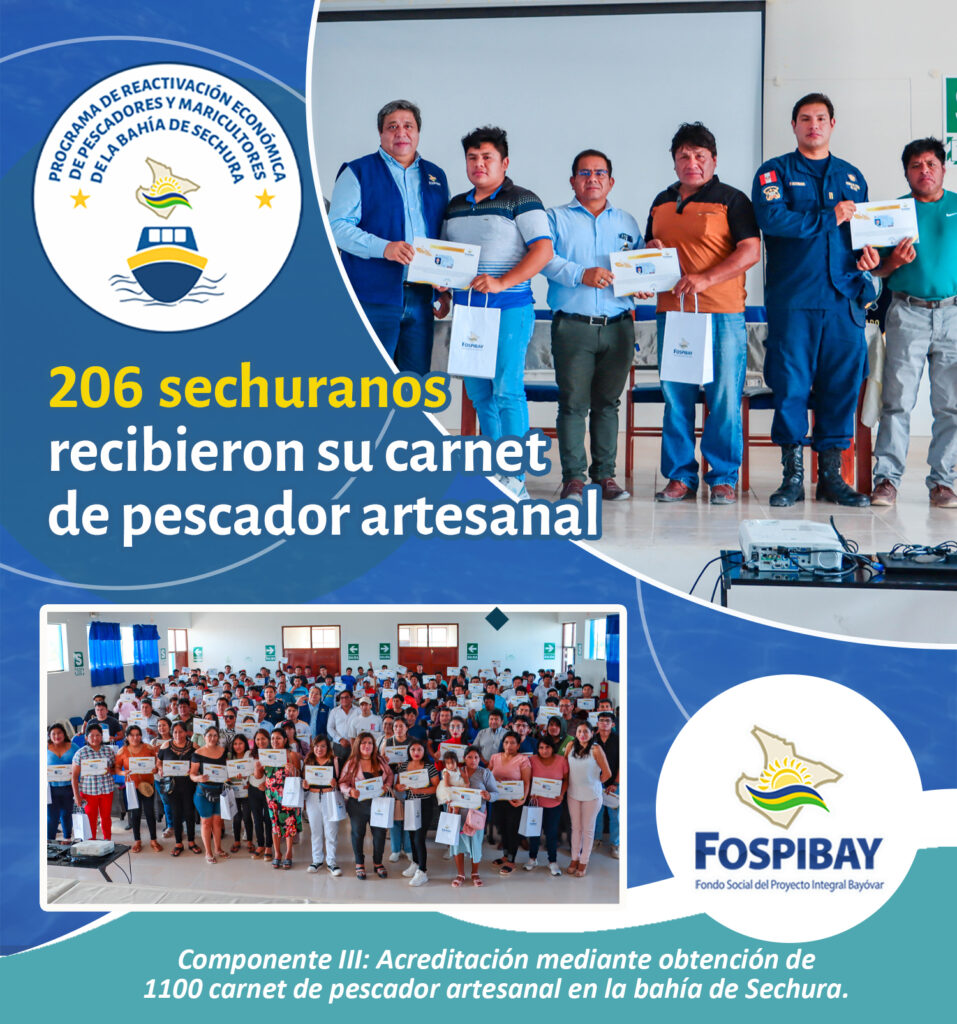 🔹Un total de 206 pescadores de la bahía de Sechura, lograron formalizarse obteniendo el carnet que los acredita como “pescadores artesanales”, esto gracias al Fondo Social Integral Bayóvar (Fospibay). Con ello, se proyecta acreditar a 1100 hombres de mar, a fin de mejorar sus condiciones laborales.