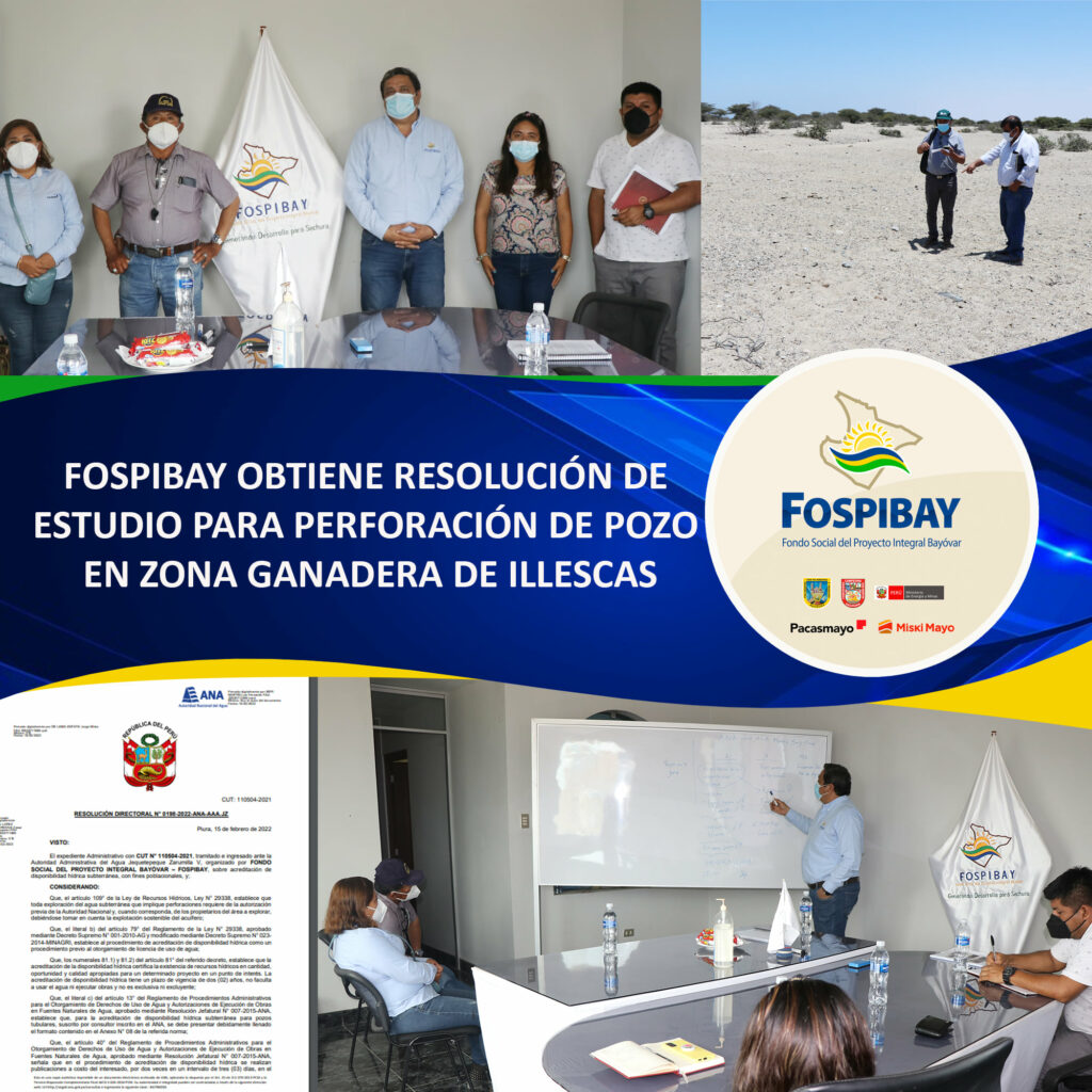 Gracias a las gestiones del Gerente Ing. Segundo Reusche y el equipo técnico del FOSPIBAY se ha logrado obtener la Resolución Directoral N°. 0198-2022-ANA-AAA.JZ, por parte de la Autoridad Nacional del Agua que aprueba el estudio de acreditación de disponibilidad hídrica subterránea para desarrollar un proyecto con fines poblacionales ubicado en el sector Illescas, distrito y provincia de Sechura.