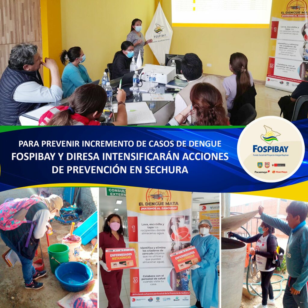 El gerente del FOSPIBAY señaló que se intensificarán las actividades de prevención en toda la provincia de Sechura e indicó que “Se ha distribuido material comunicacional en los 20 establecimientos de salud de la provincia, UGEL Sechura, promotoras del proyecto PROSAN, que también financia el FOSPIBAY, todo ello para concientizar e instruir a la población en la prevención y ante la preocupación vamos a seguir uniendo esfuerzos para proteger a la población sechurana y hacerle frente al incremento de casos de dengue. Estamos reforzando la eliminación de criaderos y capacitación para realizar el proceso de auto inspección en casa y una masiva acción comunicacional”, remarcó Segundo Reusche.