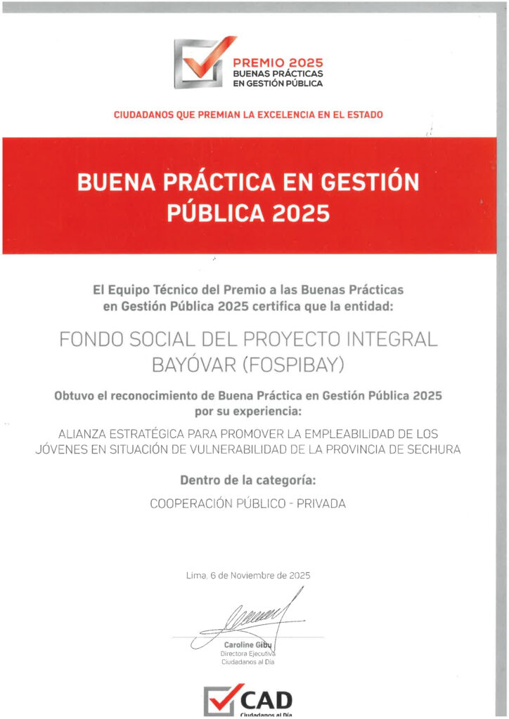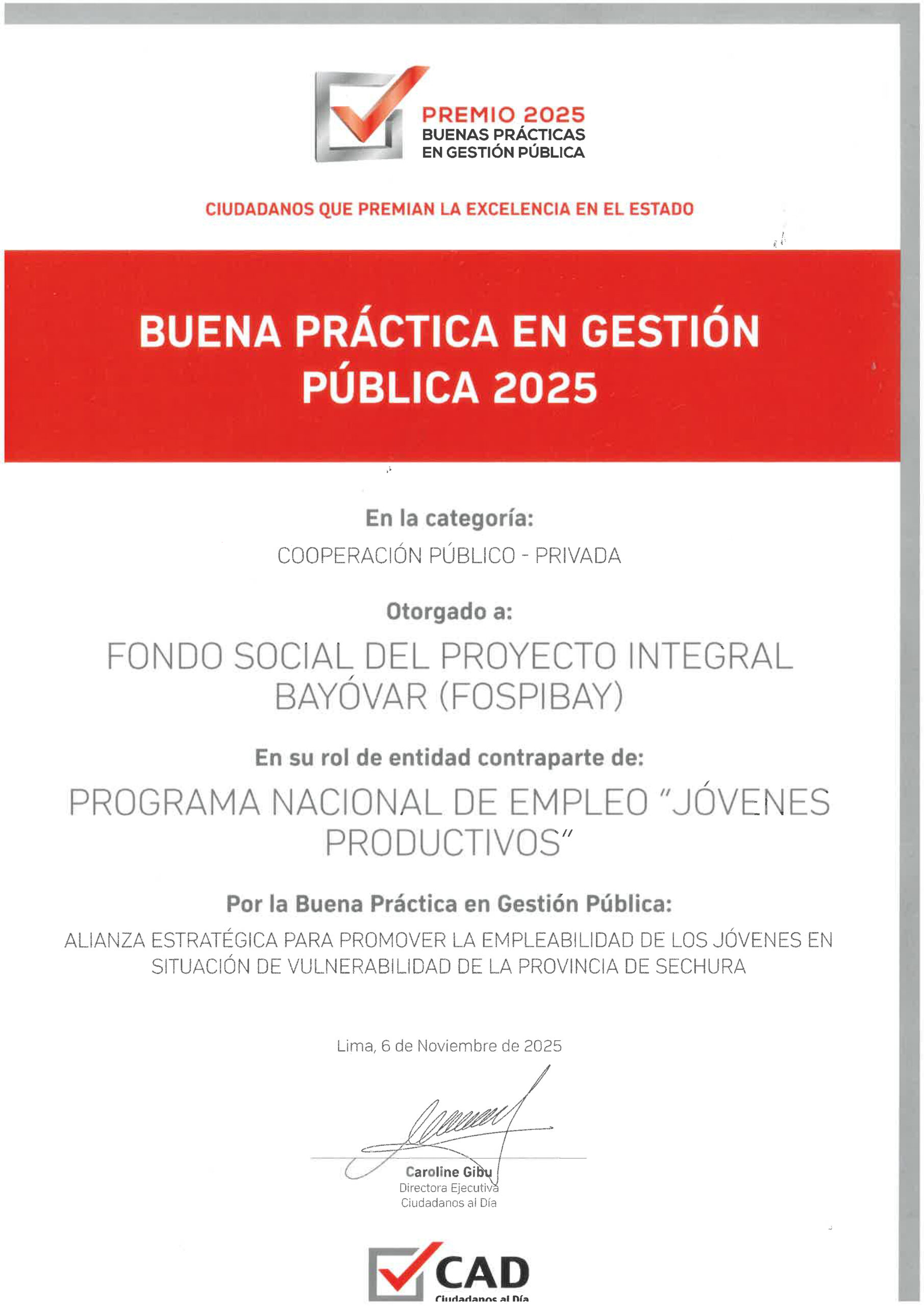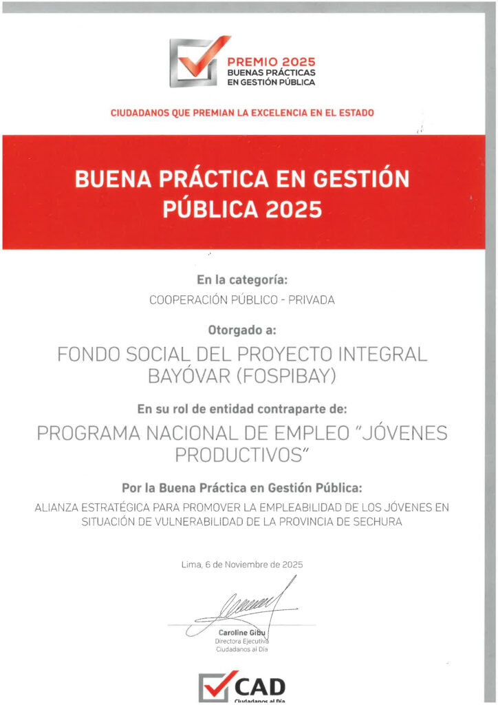 Fondo Social del Proyecto Integral Bayóvar – FOSPIBAY, junto al programa “Jóvenes Productivos” del MTPE, fue distinguido por la práctica “Alianza para promover la empleabilidad de los jóvenes en situación de vulnerabilidad de la provincia de Sechura”, en la categoría cooperación público – privada.