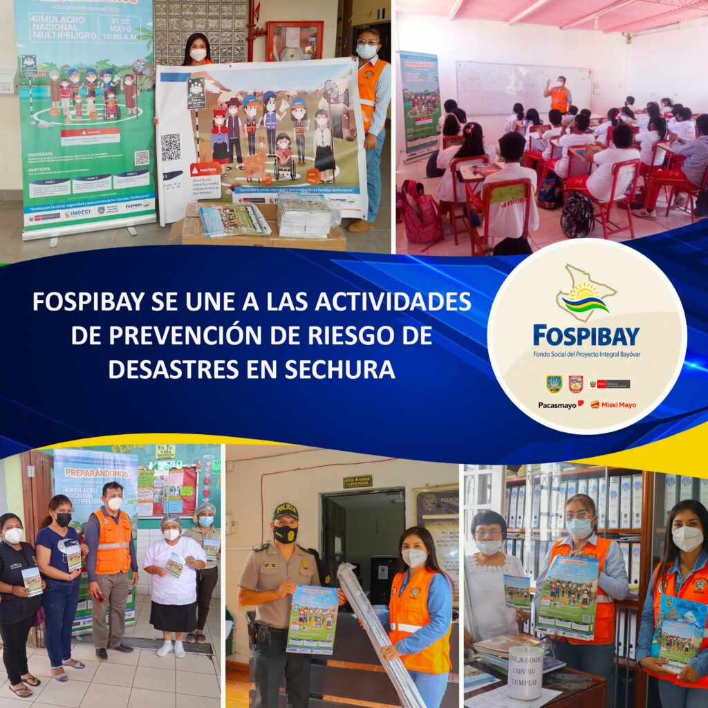En ese sentido el FOSPIBAY ha provisto de material de difusión al personal de Defensa Civil requeridos para las capacitaciones y charlas para dar a conocer las acciones a cumplir para estar preparados ante un eventual fenómeno natural, asimismo, la distribución de afiches, roll screens y volantes a instituciones públicas como el Centro de Salud Sechura, UGEL, Parroquia San Martín de Tours y Comisaría Sectorial.