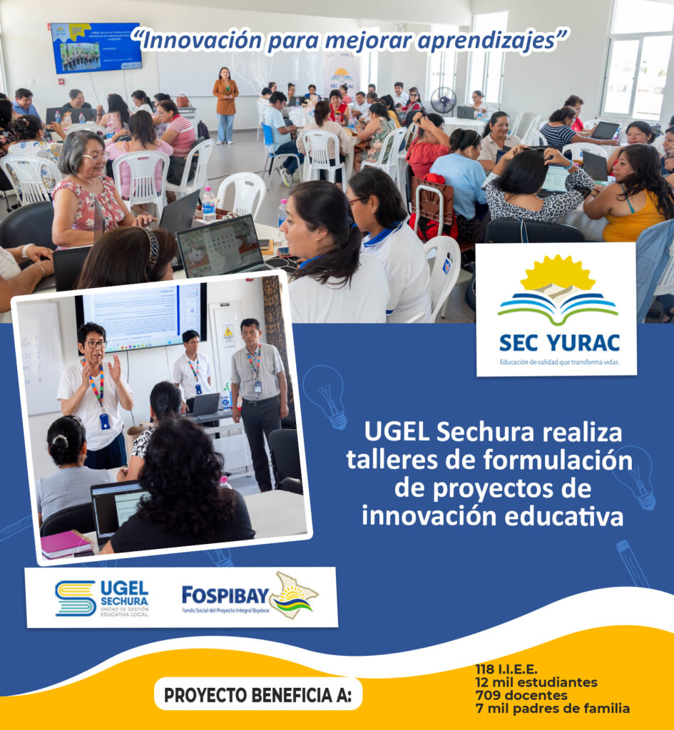 Con el objetivo de fortalecer las competencias de los docentes y directivos en la formulación de proyectos de innovación educativa, la UGEL Sechura a través del Proyecto Educativo “Sec Yurac” realizó talleres contextualizados para que nuestras IIEE estén preparadas para participar de concursos de innovación educativa, locales, regionales y nacionales.